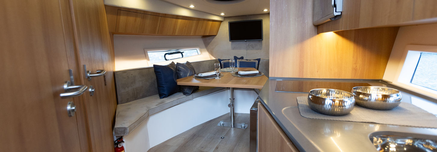 Interior with a master cabin, including bed and sofa, bathroom with shower, full kitchen with microwave, induction hob and refrigerator, and a reversible bow cabin between dining room and double bed.